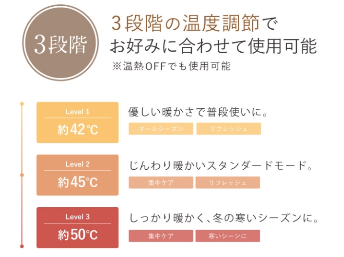 加圧と合わせて温熱ケアも可能で、温度を3段階で調整できます(約42℃/約45℃/約50℃)※温熱OFFでも使用可。